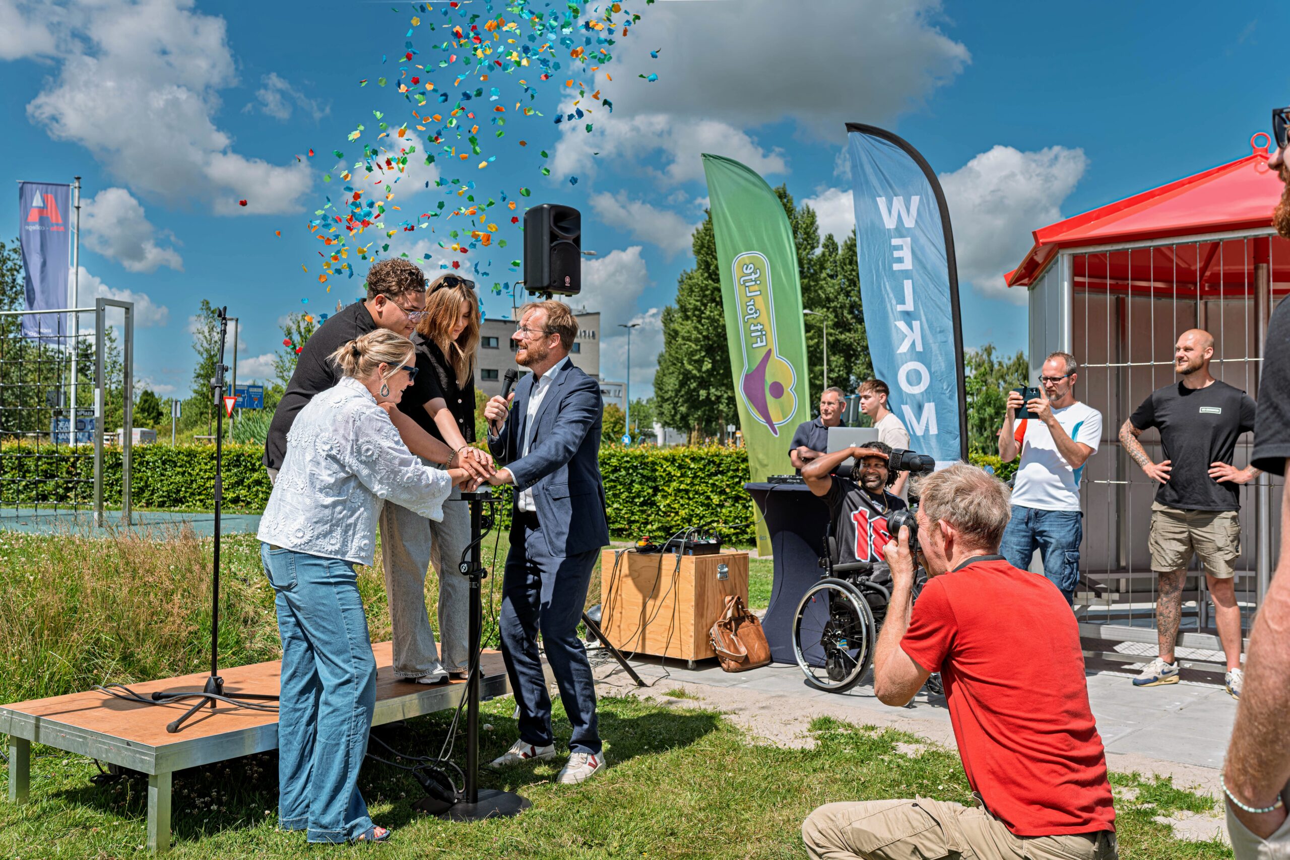 De jongeren hebben er, samen met betrokken medewerkers van WIJ Lewenborg, Politie, Bslim, gemeente Groningen, Alfa-college en de andere scholen, een leuke en feestelijke opening van gemaakt. Er was muziek, een lekker zonnetje, hapjes, smoothies en limonade. Jongeren voetbalden naast de JOP en er werd gekletst en gelachen. Een succes!