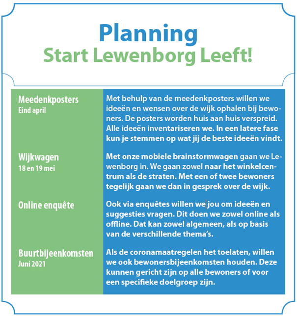 Om ‘Lewenborg Leeft!’ tot een succes te maken, is jouw inbreng als bewoner onmisbaar. Op allerlei mogelijke manieren gaan we jou de komende tijd hiervoor benaderen. Om zo jouw ideeën en suggesties te leren kennen. Hoe we dat onder meer gaan doen, zie je in onderstaande planning.