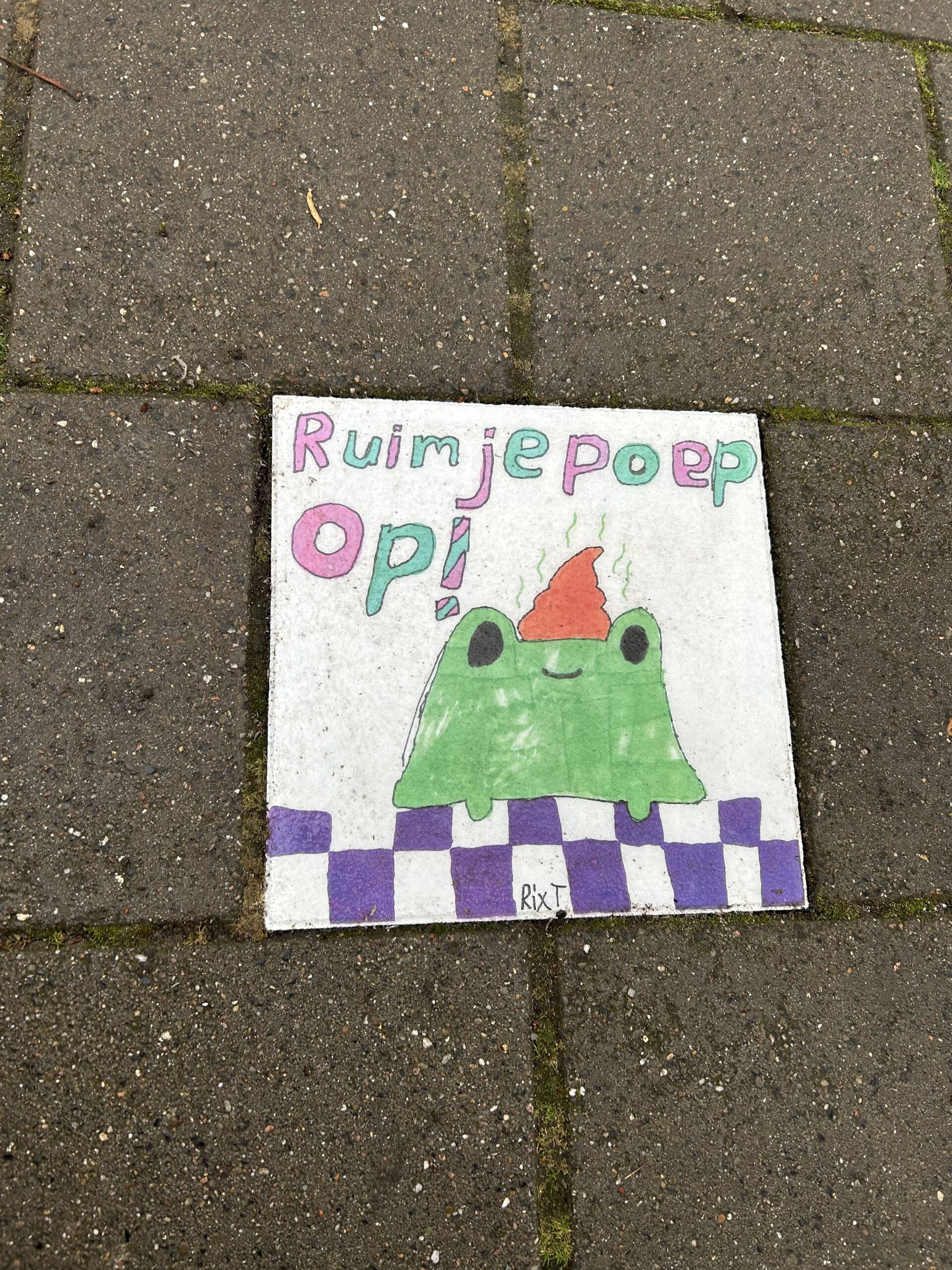 Op 14 januari hebben kinderen uit Lewenborg stoeptegels met hun tekeningen gelegd. Ze hebben één duidelijke boodschap aan alle hondeneigenaars: “Ruim je poep op mien jung!”