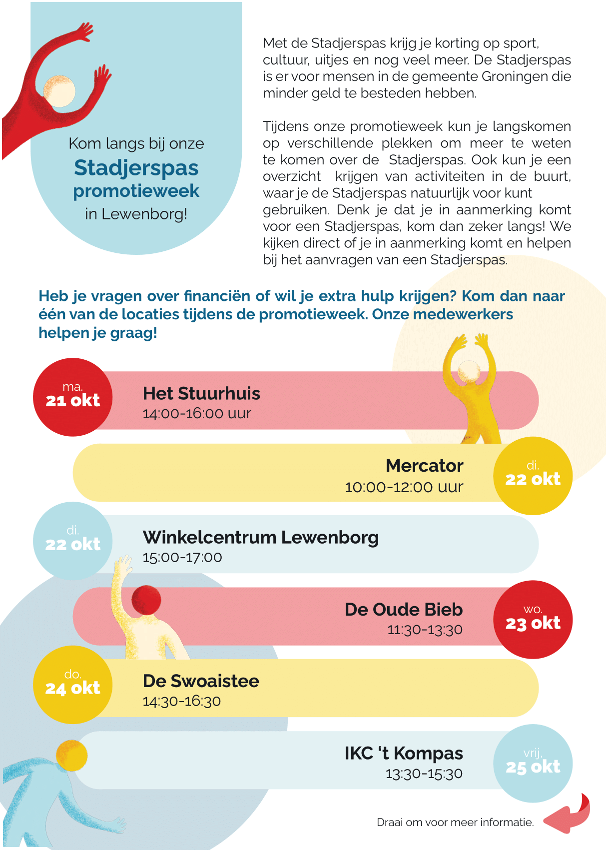 Kom langs voor persoonlijk advies over de Stadjerspas, en als je vragen hebt over je financiën of extra hulp nodig hebt, staan onze medewerkers ook voor je klaar. Het doel is om het voor iedereen in Groningen mogelijk te maken om mee te doen aan leuke activiteiten, ongeacht je budget.