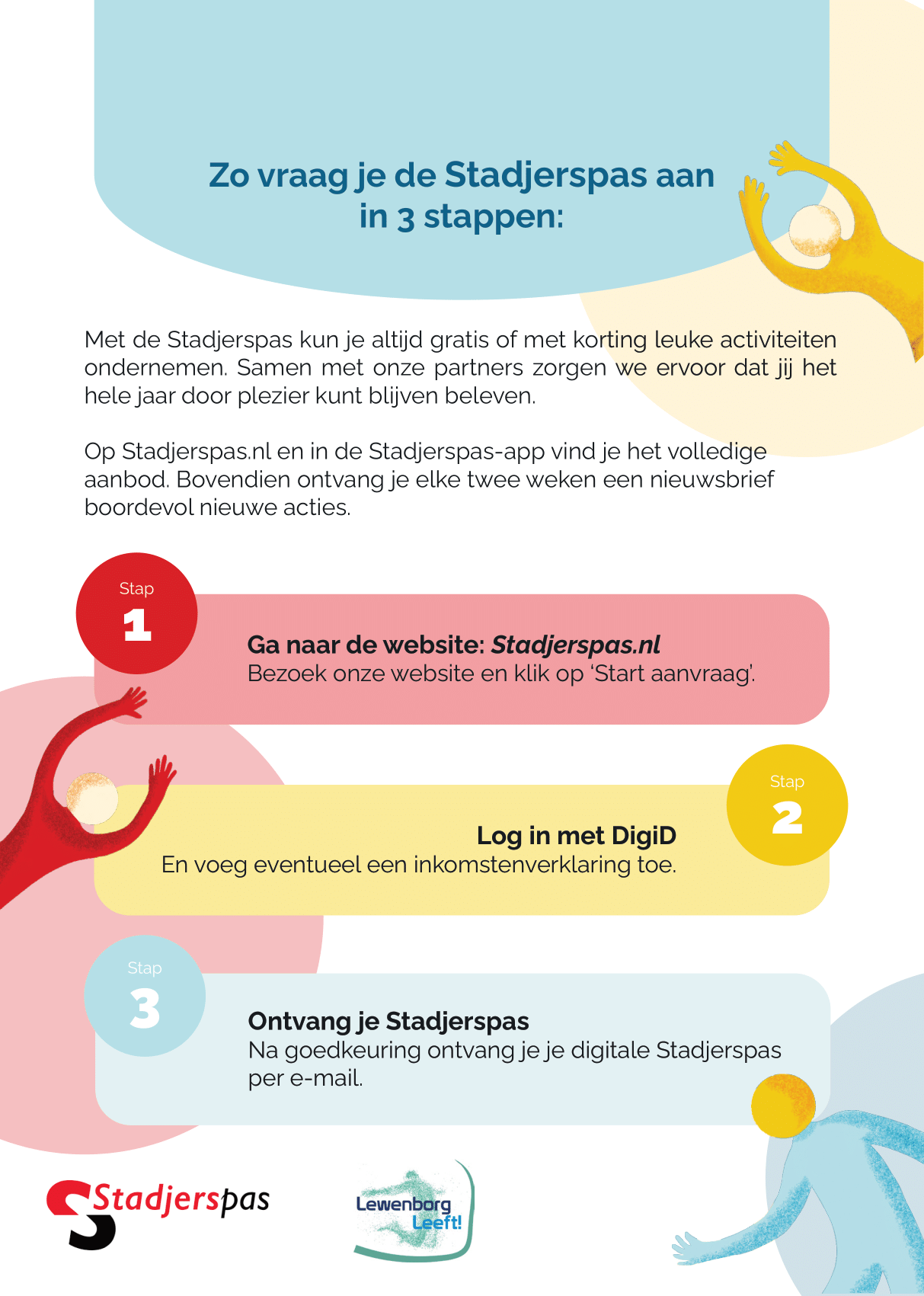 Op Stadjerspas.nl en in de Stadjerspas-app vind je een volledig overzicht van alle activiteiten en kortingsacties waar je gebruik van kunt maken. Bovendien ontvang je tweewekelijks een nieuwsbrief met nieuwe aanbiedingen en acties.