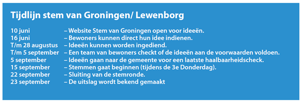In het vorige nummer van de Lewenborger hebben we het wijkbudget al aangekondigd. Op dat moment waren we nog druk bezig met de organisatie van het proces. Dat is nu klaar. Sinds 10 juni is de Stem van Groningen open voor het indienen van ideeën. Hoe dat werkt lees je in dit artikel.