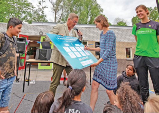 Tijdens de feestelijke bijeenkomst tekende Marjolein Wildeboer, directeur van de school, het bord in aanwezigheid van Kor Posthumus, projectleider Verlengde Schooldag Beijum en Lewenborg.